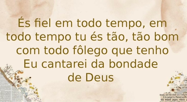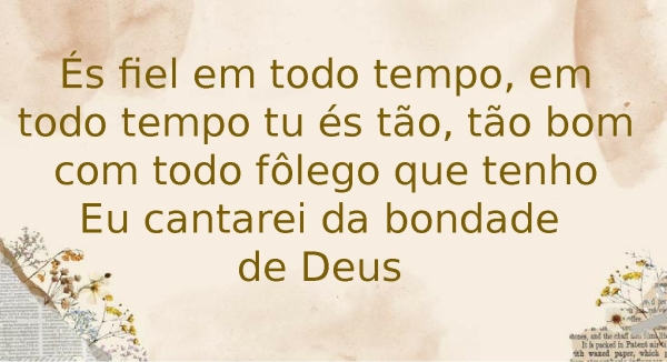 - És fiel em todo tempo, em todo tempo tu és tão, tão bom com todo fôlego que tenhoEu cantarei da bondade De Deus