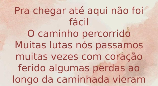 - Pra chegar até aqui não foi fácilO caminho percorridoMuitas lutas nós passamos muitas vezes com coração ferido algumas perdas ao longo da caminhada vieram pra abalar nossa fé
