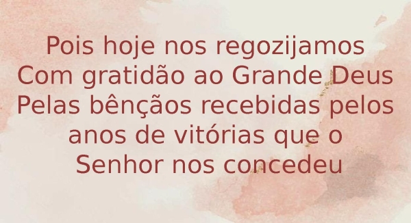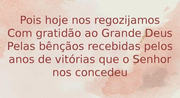 - Pois hoje nos regozijamosCom gratidão ao Grande DeusPelas bênçãos recebidas pelos anos de vitórias que o Senhor nos concedeu