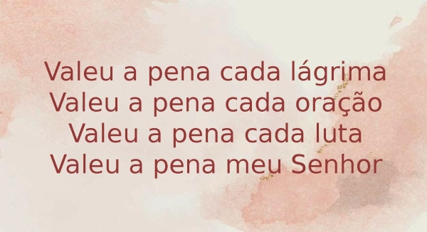 - Valeu a pena cada lágrimaValeu a pena cada oraçãoValeu a pena cada lutaValeu a pena meu Senhor