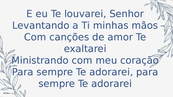 - E eu Te louvarei, SenhorLevantando a Ti minhas mãosCom canções de amor Te exaltareiMinistrando com meu coraçãoPara sempre Te adorarei, para sempre Te adorarei