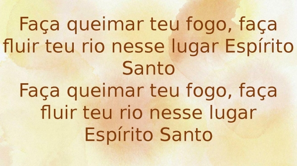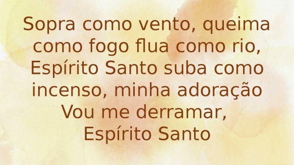 - Sopra como vento, queima como fogo flua como rio, Espírito Santo suba como incenso, minha adoraçãoVou me derramar, Espírito Santo