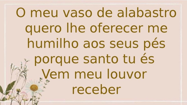 - O meu vaso de alabastro quero lhe oferecer me humilho aos seus pés porque santo tu és Vem meu louvor receber