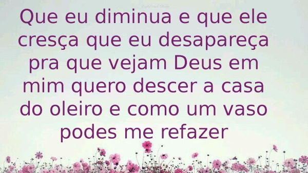 - Que eu diminua e que ele cresça que eu desapareça pra que vejam Deus em mim quero descer a casa do oleiro e como um vaso podes me refazer