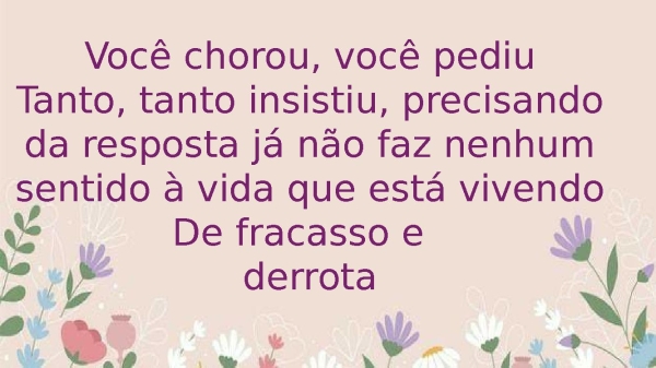 - Você chorou, você pediuTanto, tanto insistiu, precisando da resposta já não faz nenhum sentido à vida que está vivendoDe fracasso e derrota