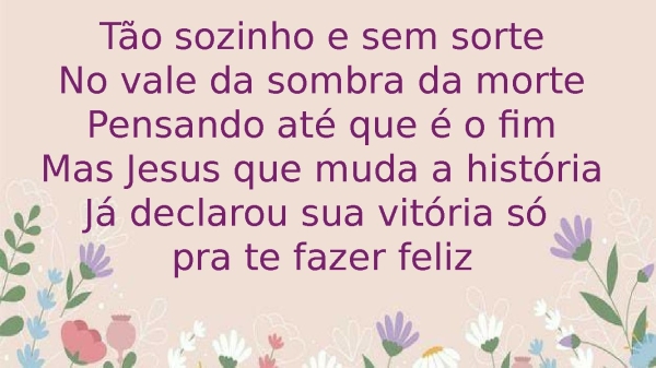 - Tão sozinho e sem sorteNo vale da sombra da mortePensando até que é o fimMas Jesus que muda a históriaJá declarou sua vitória só pra te fazer feliz