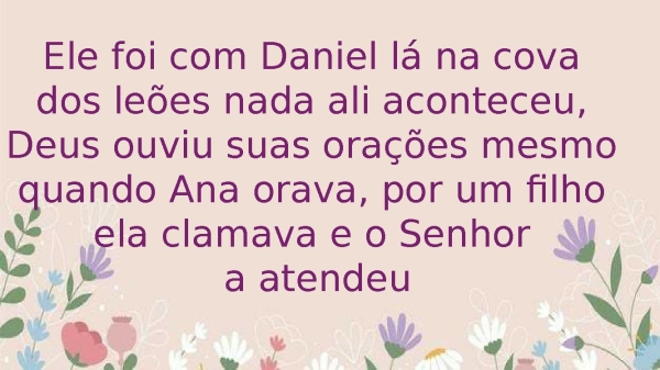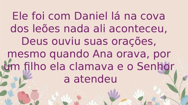 - Ele foi com Daniel lá na cova dos leões nada ali aconteceu, Deus ouviu suas orações, mesmo quando Ana orava, por um filho ela clamava e o Senhor a atendeu