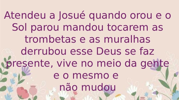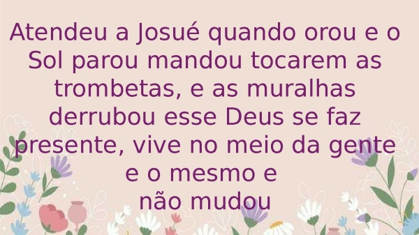 - Atendeu a Josué quando orou e o Sol parou mandou tocarem as trombetas e as muralhas derrubou esse Deus se faz presente, vive no meio da gente e o mesmo e não mudou