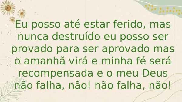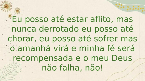 - Eu posso até estar aflito, mas nunca derrotado eu posso até chorar, eu posso até sofrer mas o amanhã virá e minha fé será recompensada e o meu Deus não falha, não!