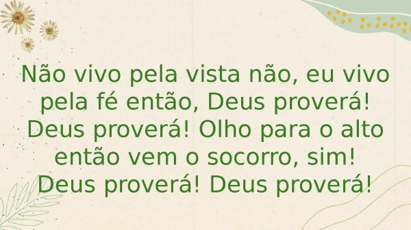 - Não vivo pela vista não, eu vivo pela fé então, Deus proverá! Deus proverá! Olho para o alto então vem o socorro, sim!Deus proverá! Deus proverá!