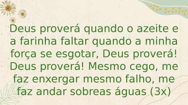 - Deus proverá quando o azeite e a farinha faltar quando a minha força se esgotar, Deus proverá! Deus proverá! Mesmo cego, me faz enxergar mesmo falho, me faz andar sobreas águas (3x)