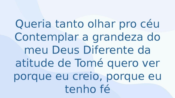 - Queria tanto olhar pro céuContemplar a grandeza do meu Deus Diferente da atitude de Tomé quero ver porque eu creio, porque eu tenho fé