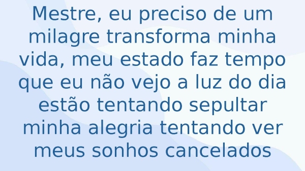 - Mestre, eu preciso de um milagre transforma minha vida, meu estado faz tempo que eu não vejo a luz do dia estão tentando sepultar minha alegria tentando ver meus sonhos cancelados