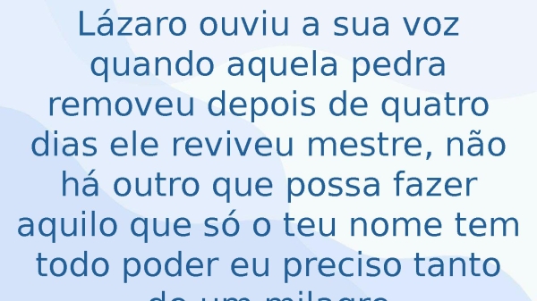 - Lázaro ouviu a sua voz quando aquela pedra removeu depois de quatro dias ele reviveu mestre, não há outro que possa fazer aquilo que só o teu nome tem todo poder eu preciso tanto de um milagre