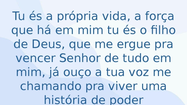 - Tu és a própria vida, a força que há em mim tu és o filho de Deus, que me ergue pra vencer Senhor de tudo em mim, já ouço a tua voz me chamando pra viver uma história de poder