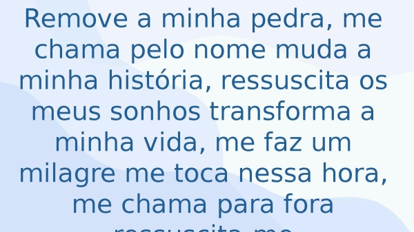 - Remove a minha pedra, me chama pelo nome muda a minha história, ressuscita os meus sonhos transforma a minha vida, me faz um milagre me toca nessa hora, me chama para fora ressuscita-me