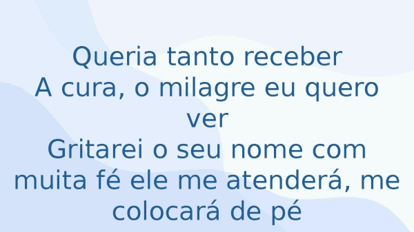 - Queria tanto receberA cura, o milagre eu quero verGritarei o seu nome com muita fé ele me atenderá, me colocará de pé