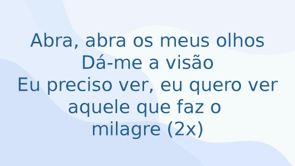 - Abra, abra os meus olhosDá-me a visãoEu preciso ver, eu quero ver aquele que faz o milagre (2x)