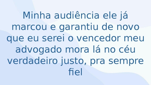 - Minha audiência ele já marcou e garantiu de novo que eu serei o vencedor meu advogado mora lá no céu verdadeiro justo, pra sempre fiel