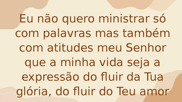 - Eu não quero ministrar só com palavras mas também com atitudes meu Senhor que a minha vida seja a expressão do fluir da Tua glória, do fluir do Teu amor