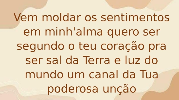 - Vem moldar os sentimentos em minh'alma quero ser segundo o teu coração pra ser sal da Terra e luz do mundo um canal da Tua poderosa unção