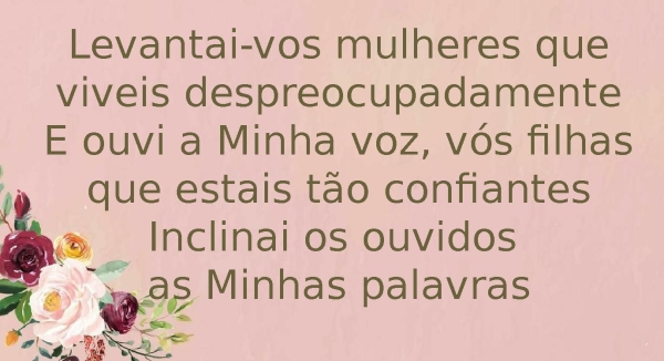 - Levantai-vos mulheres que viveis despreocupadamenteE ouvi a Minha voz, vós filhas que estais tão confiantesInclinai os ouvidos as Minhas palavras