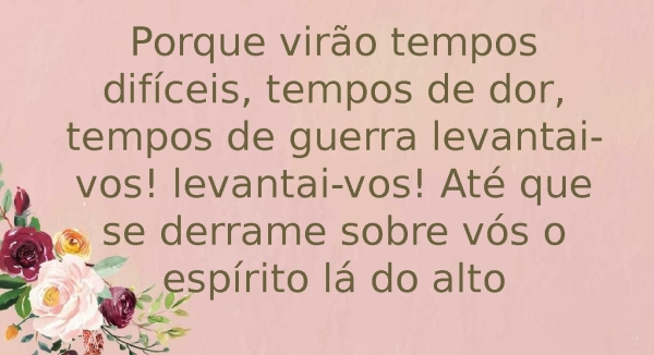 - Porque virão tempos difíceis, tempos de dor, tempos de guerra levantai-vos! levantai-vos! Até que se derrame sobre vós o espírito lá do alto