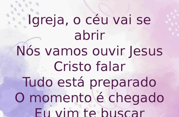 - Igreja, o céu vai se abrirNós vamos ouvir Jesus Cristo falarTudo está preparadoO momento é chegadoEu vim te buscar