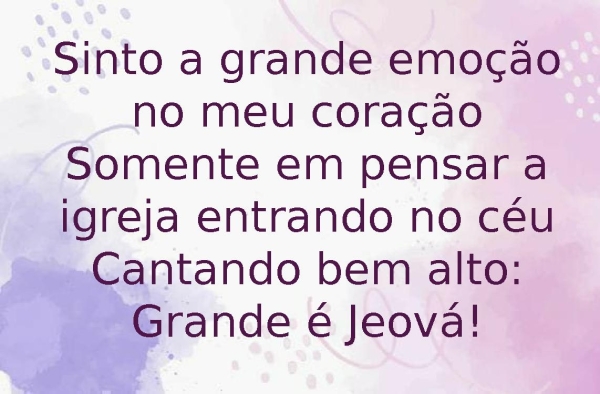 - Sinto a grande emoção no meu coraçãoSomente em pensar a igreja entrando no céuCantando bem alto: Grande é Jeová!