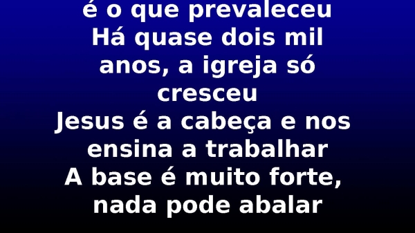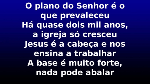 - O plano do Senhor é o que prevaleceuHá quase dois mil anos, a igreja só cresceuJesus é a cabeça e nos ensina a trabalharA base é muito forte, nada pode abalar