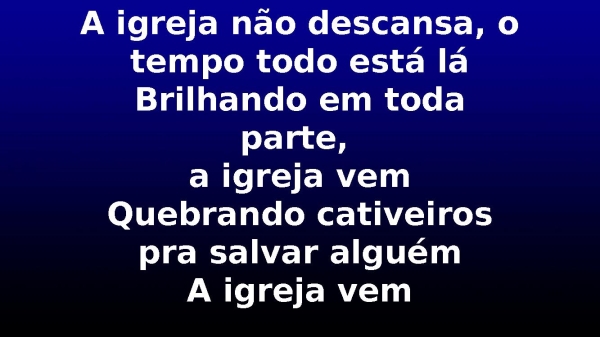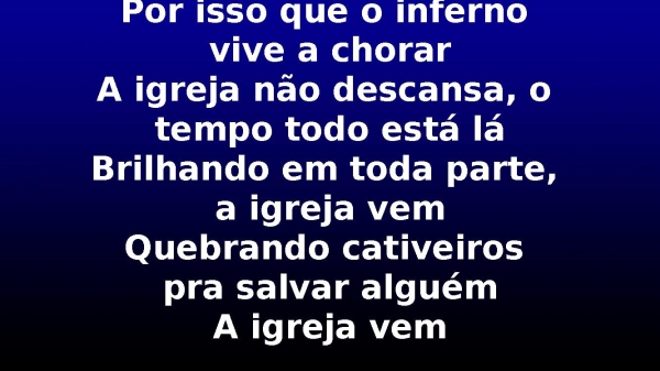 - Por isso o inferno vive a chorarA igreja não descansa, o tempo todo está láBrilhando em toda parte, a igreja vemQuebrando cativeiros pra salvar alguémA igreja vem