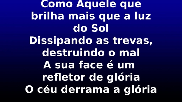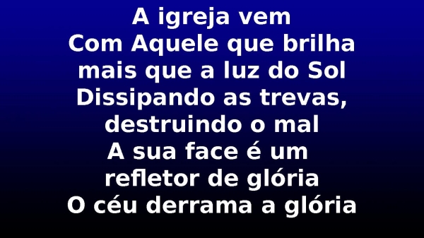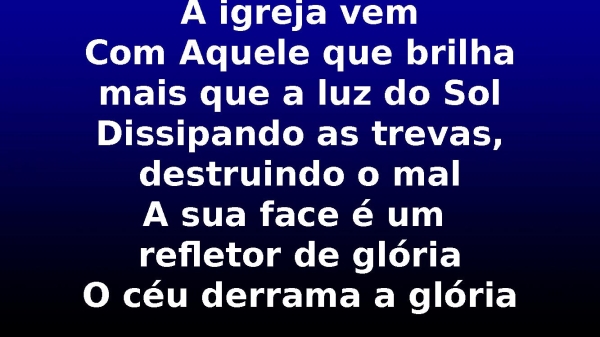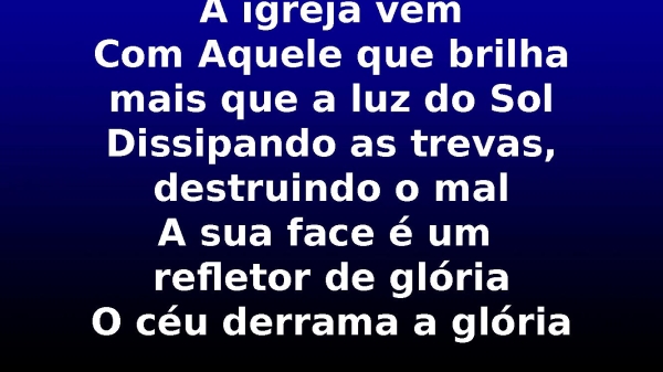 - A igreja vemCom Aquele que brilha mais que a luz do SolDissipando as trevas, destruindo o malA sua face é um refletor de glóriaO céu derrama a glória