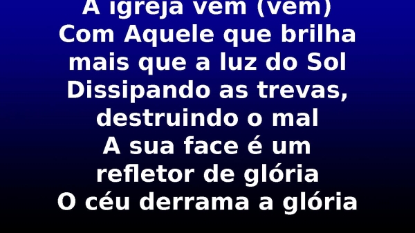 - A igreja vemComo Aquele que brilha mais que a luz do SolDissipando as trevas, destruindo o malA sua face é um refletor de glóriaO céu derrama a glória