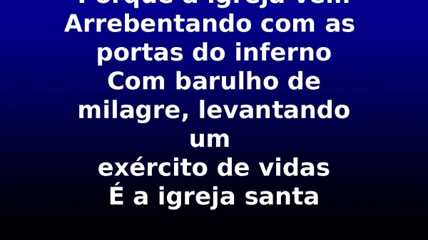 - Porque a igreja vemArrebentando com as portas do infernoCom barulho de milagre, levantando um exército de vidasÉ a igreja santa