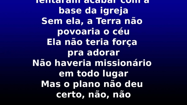 - Tentaram acabar com a base da igrejaSem ela, a Terra não povoaria o céuEla não teria força pra adorarNão haveria missionário em todo lugarMas o plano não deu certo, não, não