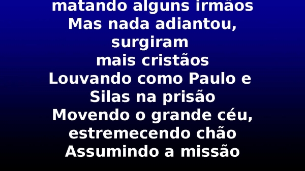 - Tentaram nos calar matando alguns irmãosMas nada adiantou, surgiram mais cristãosLouvando como Paulo e Silas na prisãoMovendo o grande céu, estremecendo chãoAssumindo a missão