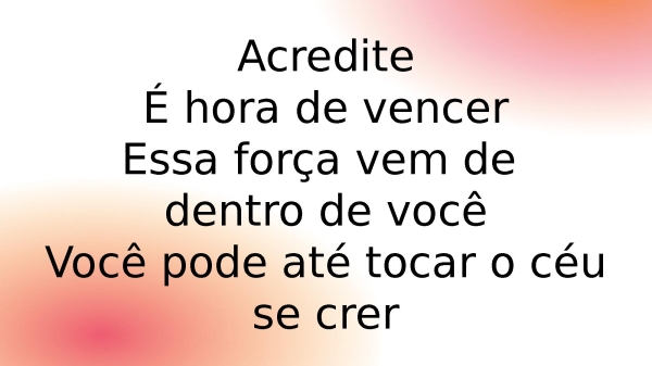 - AcrediteÉ hora de vencerEssa força vem de dentro de vocêVocê pode até tocar o céu se crer