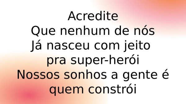 - AcrediteQue nenhum de nósJá nasceu com jeito pra super-heróiNossos sonhos a gente é quem constrói