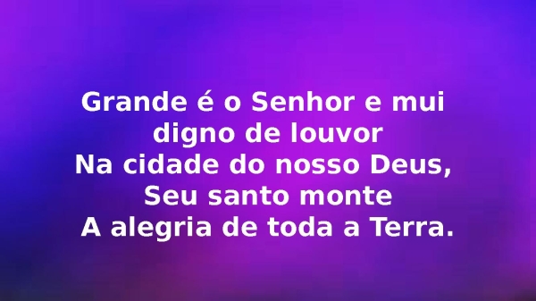 - Grande é o Senhor e mui digno de louvorNa cidade do nosso Deus, Seu santo monteA alegria de toda a Terra.