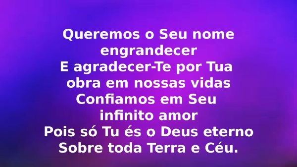 - Queremos o Seu nome engrandecerE agradecer-Te por Tua obra em nossas vidasConfiamos em Seu infinito amorPois só Tu és o Deus eternoSobre toda Terra e Céu.
