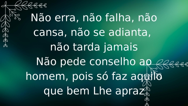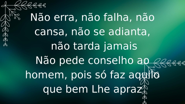 - Não erra, não falha, não cansa, não se adianta, não tarda jamaisNão pede conselho ao homem, pois só faz aquilo que bem Lhe apraz