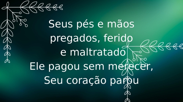 - Seus pés e mãos pregados, ferido e maltratadoEle pagou sem merecer, Seu coração parou