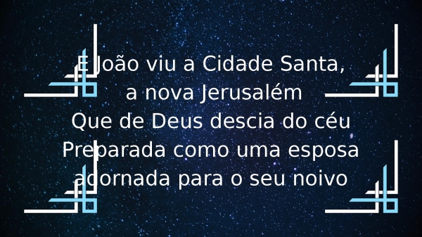 - E João viu a Cidade Santa, a nova JerusalémQue de Deus descia do céuPreparada como uma esposa adornada para o seu noivo
