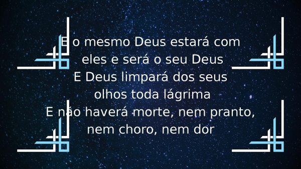 - E o mesmo Deus estará com eles e será o seu DeusE Deus limpará dos seus olhos toda lágrimaE não haverá morte, nem pranto, nem choro, nem dor