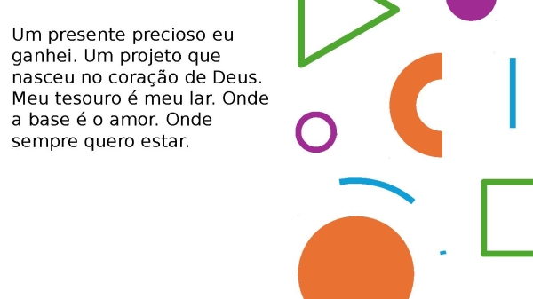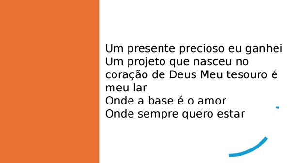 - Um presente precioso eu ganheiUm projeto que nasceu no coração de Deus Meu tesouro é meu larOnde a base é o amorOnde sempre quero estar