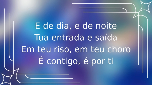 - E de dia, e de noiteTua entrada e saídaEm teu riso, em teu choroÉ contigo, é por ti