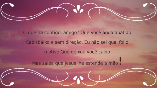 - O que há contigo, amigo? Que você anda abatidoCabisbaixo e sem direção. Eu não sei qual foi o motivo Que deixou você caídoMas saiba que Jesus lhe estende a mão!