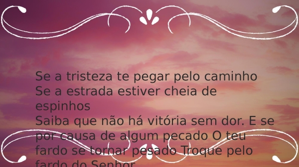 - Se a tristeza te pegar pelo caminhoSe a estrada estiver cheia de espinhosSaiba que não há vitória sem dor. E se por causa de algum pecado O teu fardo se tornar pesado Troque pelo fardo do Senhor