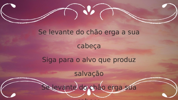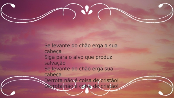 - Se levante do chão erga a sua cabeçaSiga para o alvo que produz salvaçãoSe levante do chão erga sua cabeçaDerrota não é coisa de cristão!Derrota não é coisa de cristão!