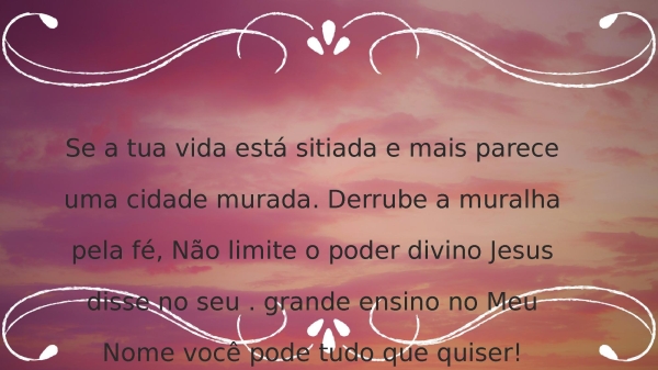 - Se a tua vida está sitiada e mais parece uma cidade murada. Derrube a muralha pela fé, Não limite o poder divino Jesus disse no seu . grande ensino no Meu Nome você pode tudo que quiser!